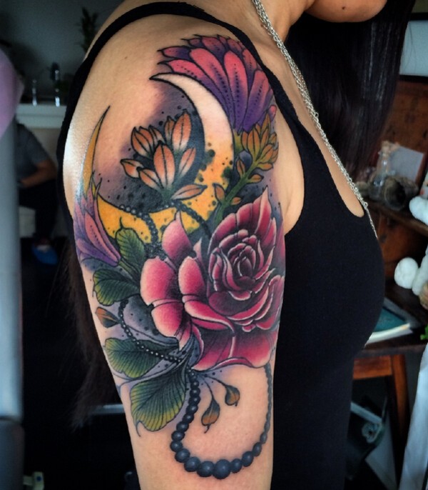 女生手臂漂亮的花卉月亮纹身
