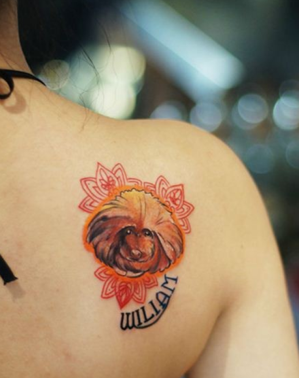 女性背部彩色狗狗纹身图案
