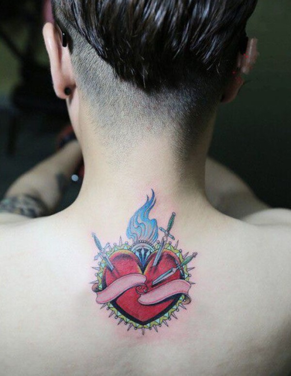 剑刺红心后颈时尚纹身