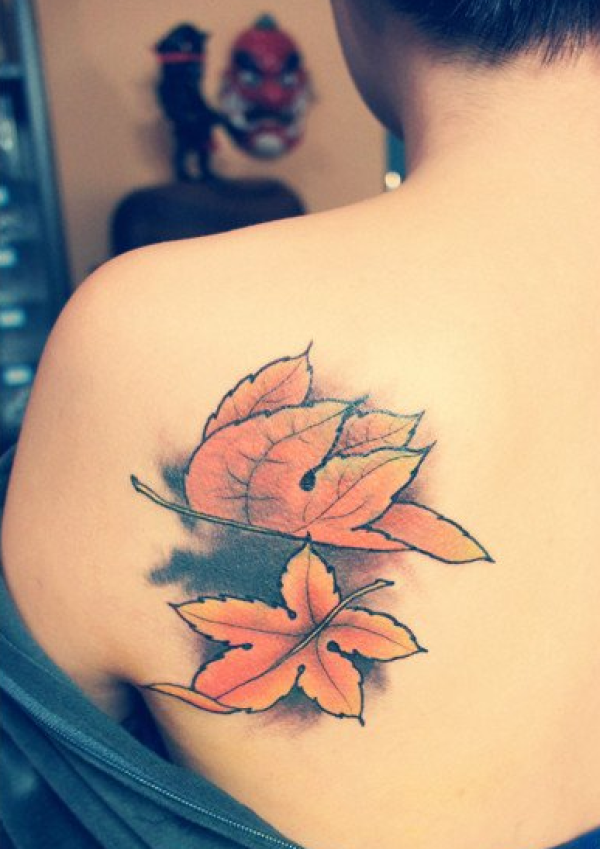 女子左后肩红色枫叶纹身图案