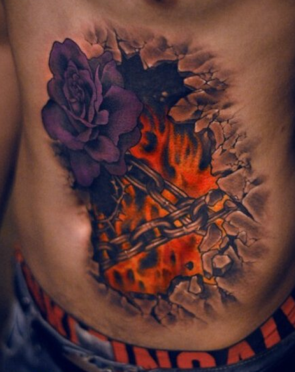 腹部彩色地裂火焰玫瑰花纹身图片