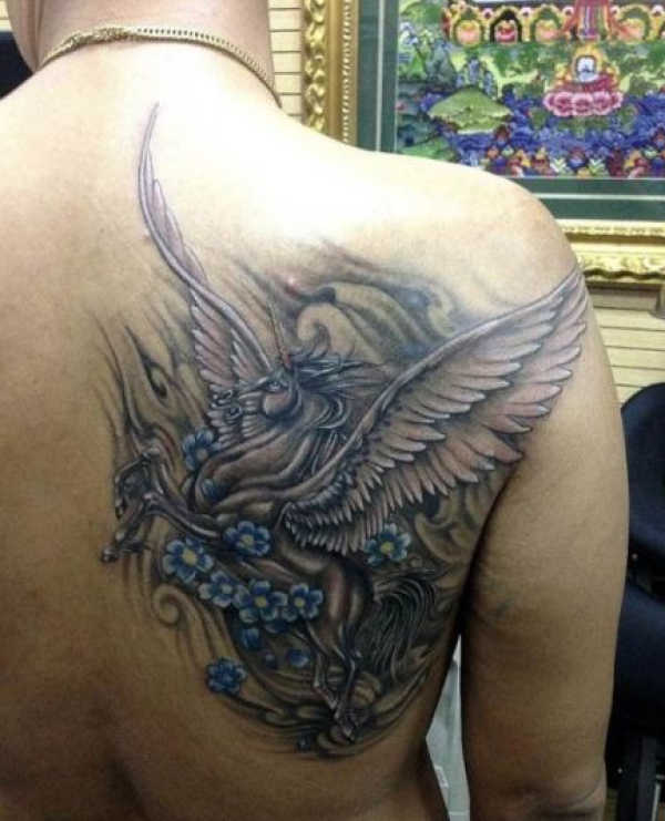 男生后肩背很酷的独角兽纹身图案