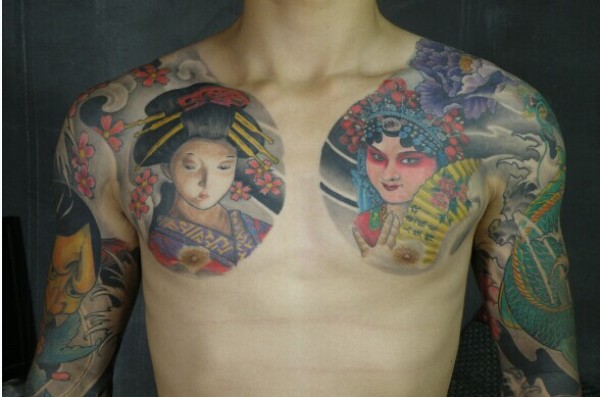 肩部漂亮的日本艺妓和中国花旦纹身图片
