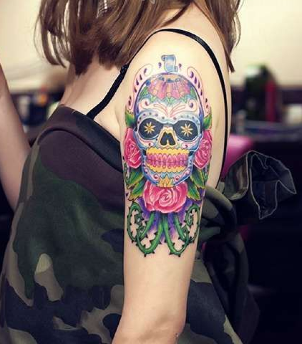 女生手臂经典潮流的骷髅与玫瑰花纹身图案