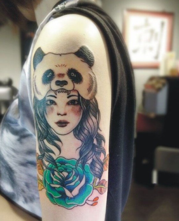 创意熊猫女花臂纹身