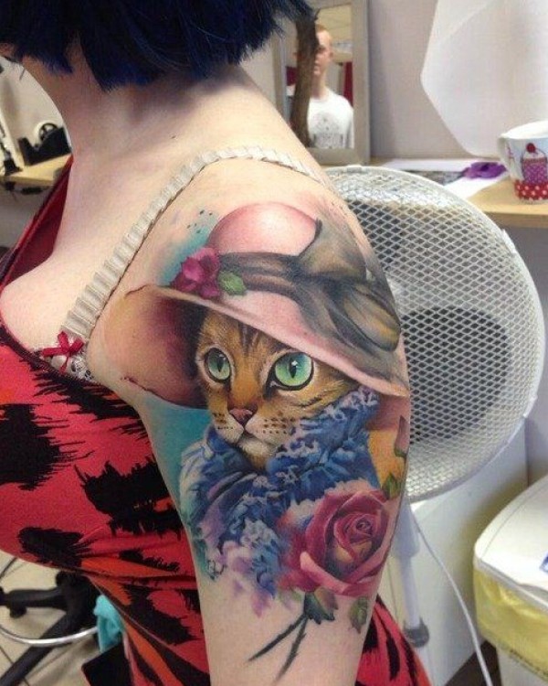 女性胳膊彩色猫咪纹身作品
