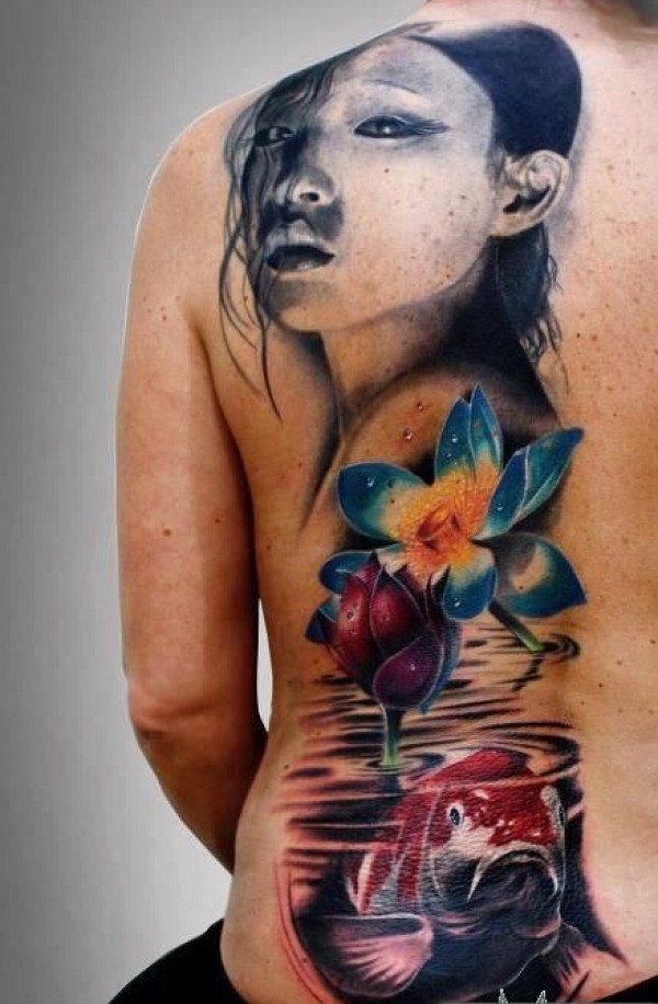 背部女孩荷花鲤鱼纹身