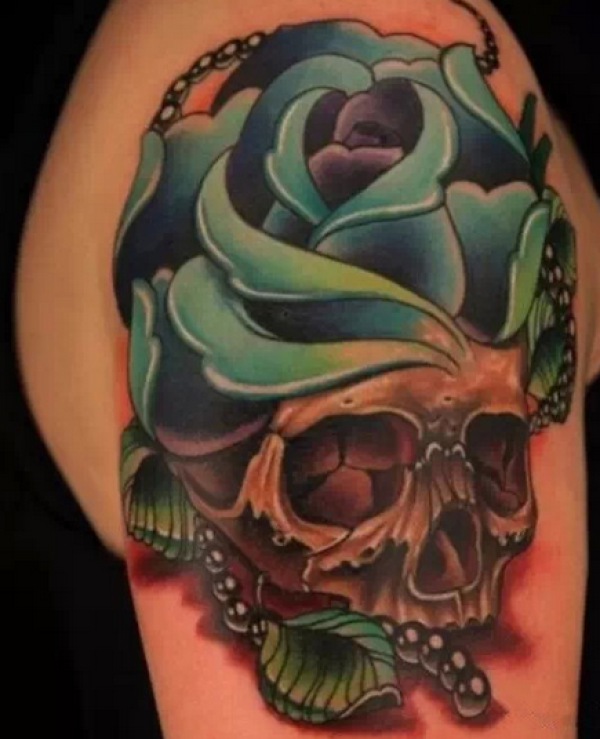 女生手臂经典潮流的骷髅与玫瑰花纹身图案
