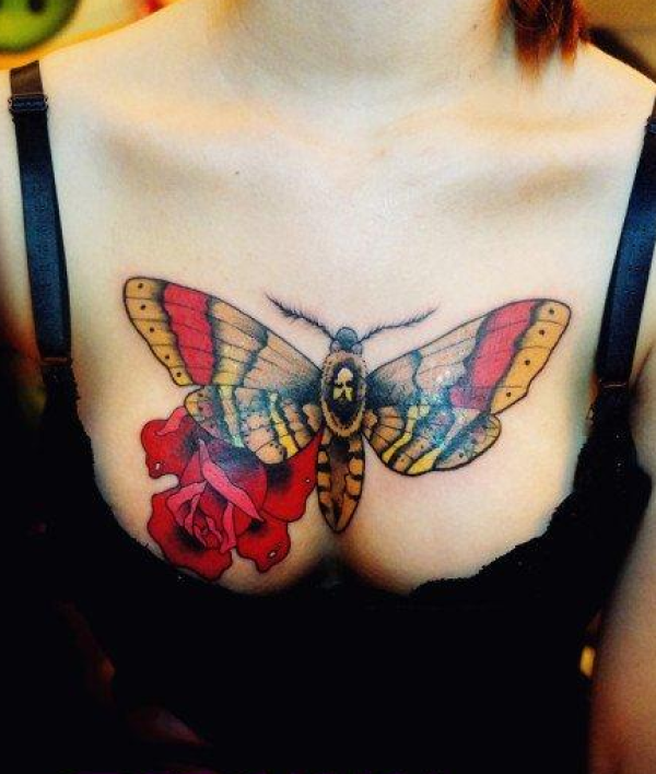 美女前胸漂亮的玫瑰飞蛾纹身图案