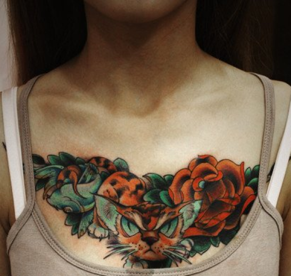 女性胸前玫瑰丛中的猫咪纹身