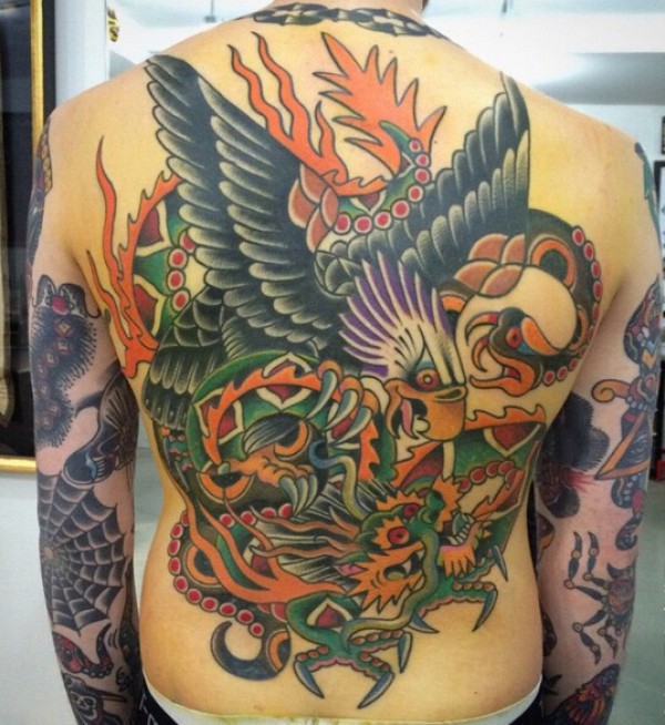 满后背的鹰抓蛇和手臂蜘蛛蜈蚣纹身