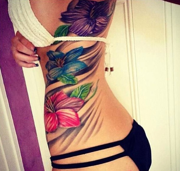 美女腰部好看的花卉纹身图案
