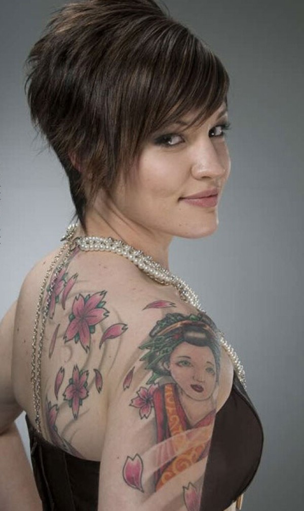 女性右肩到后背日本艺妓花瓣纹身