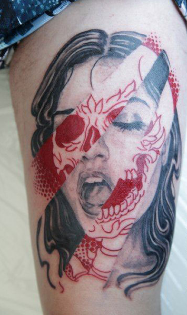 大腿上人脸外部与内部呼应纹身