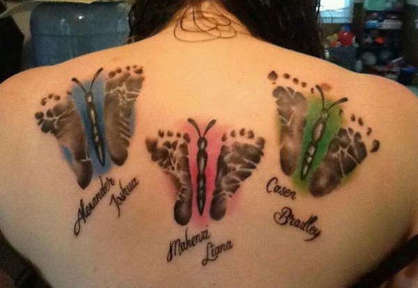 女孩后背宝宝脚印蝴蝶纹身