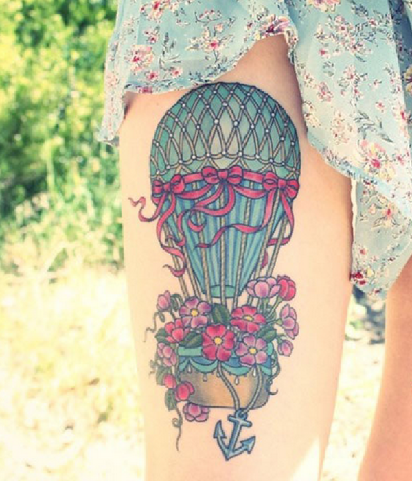 女孩大腿热气球花朵纹身