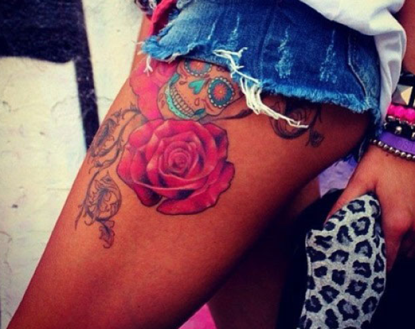 女生手臂经典潮流的骷髅与玫瑰花纹身图案
