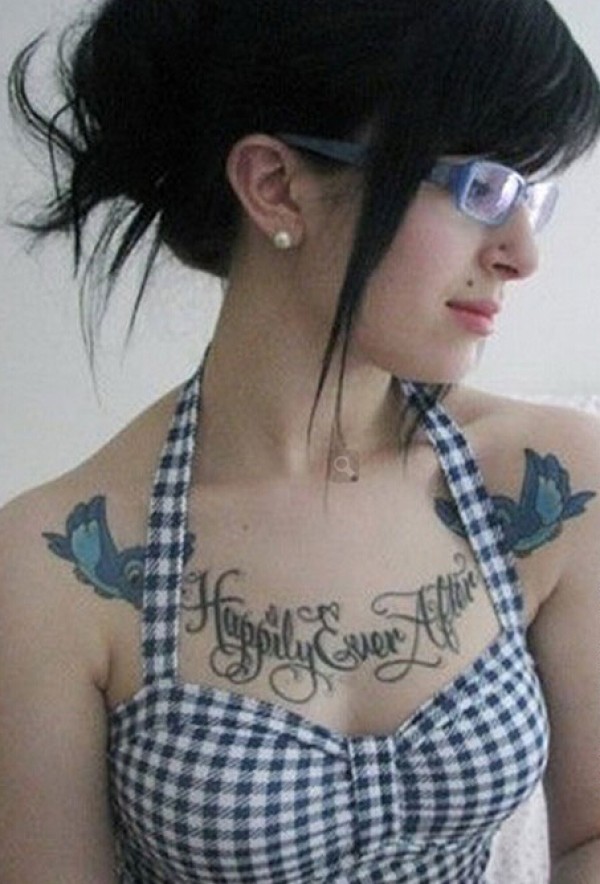 女孩胸前花体英文和小鸟纹身