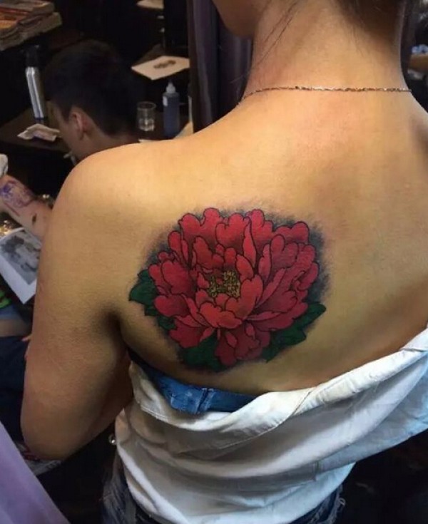 美女背部大红花纹身