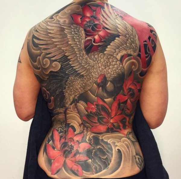 满背莲花仙鹤纹身图案