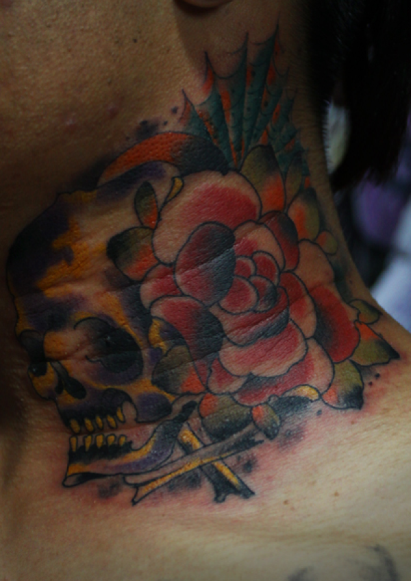 颈部骷髅和花纹身图案