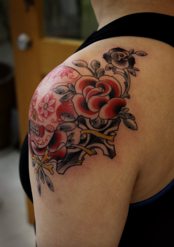 女生手臂经典潮流的骷髅与玫瑰花纹身图案