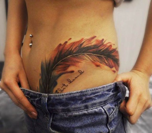 腰腹上性感的彩色羽毛纹身