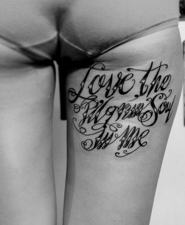 大腿上好看的花体英文纹身