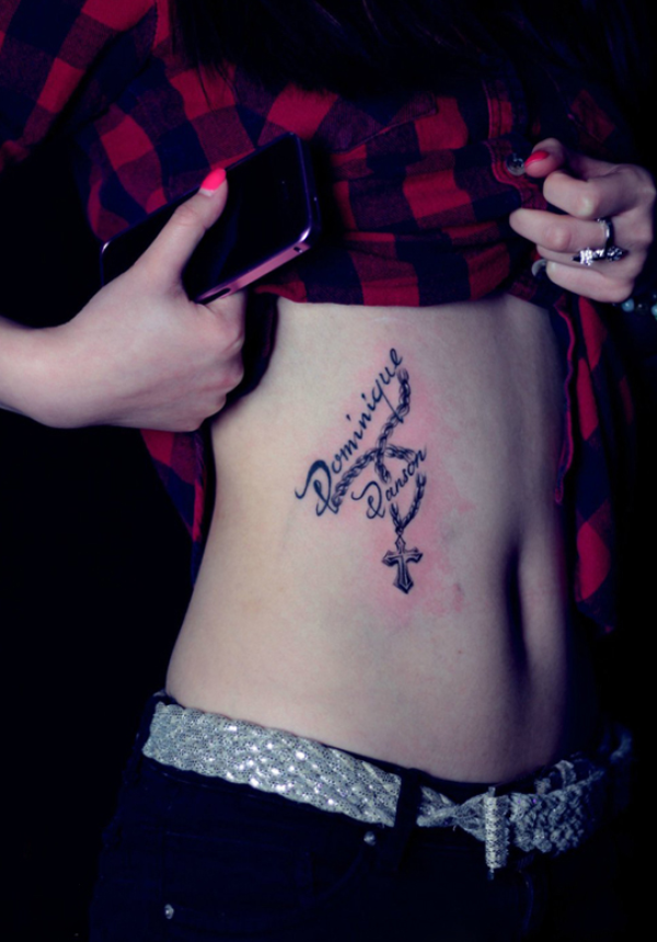 侧腰英文十字架项链纹身
