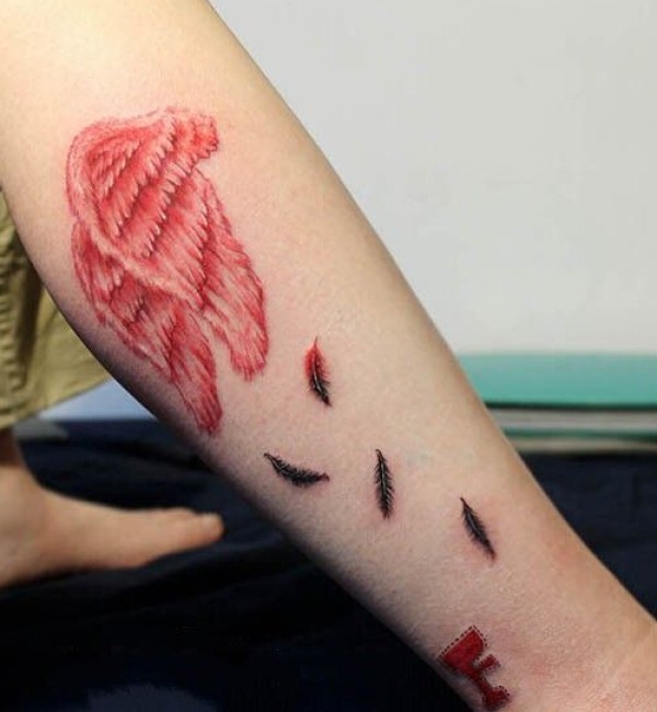 腿部红色的翅膀纹身图案
