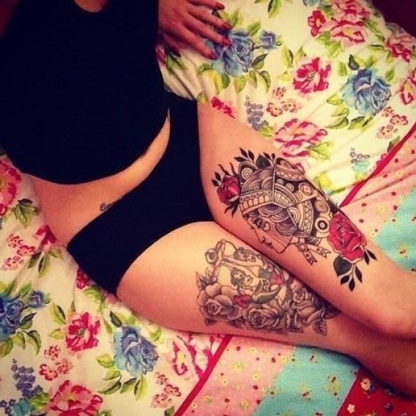传统花腿纹身--18张传统风格的大花腿纹身图案作品