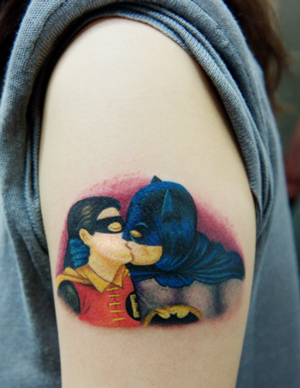 手臂蝙蝠侠和罗宾亲嘴纹身