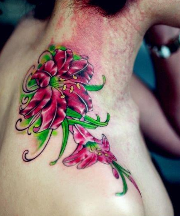 女孩子肩部精美的百合花纹身图案