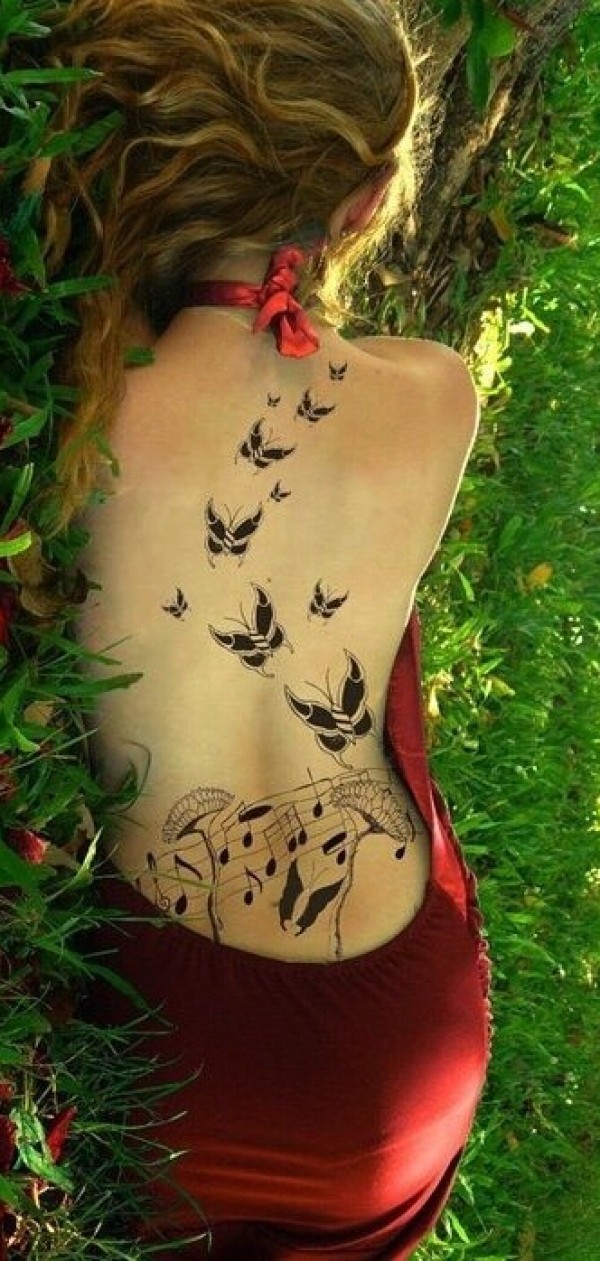 女生背部唯美漂亮音符蝴蝶朵纹身