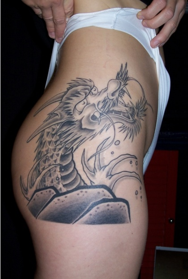 展示臀部纹身龙图案的女性