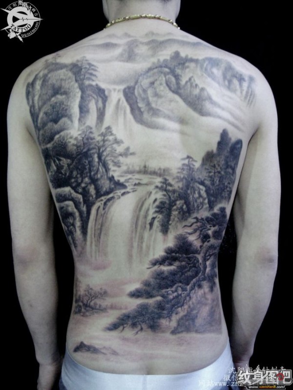 满背山水纹身 水墨风格纹身图案 沈阳指南针刺青作品