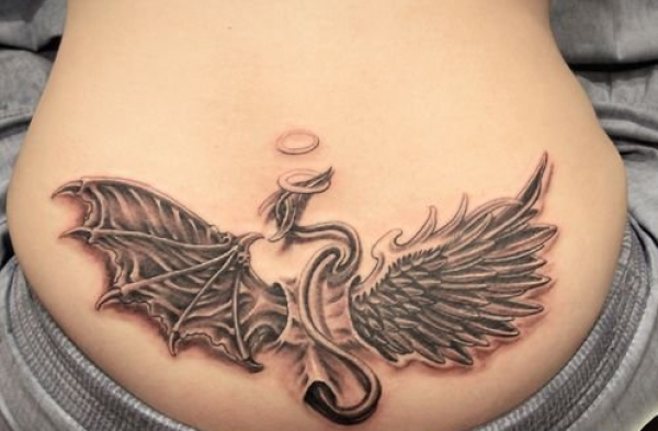 美女腰部一对天使与恶魔的翅膀纹身图案