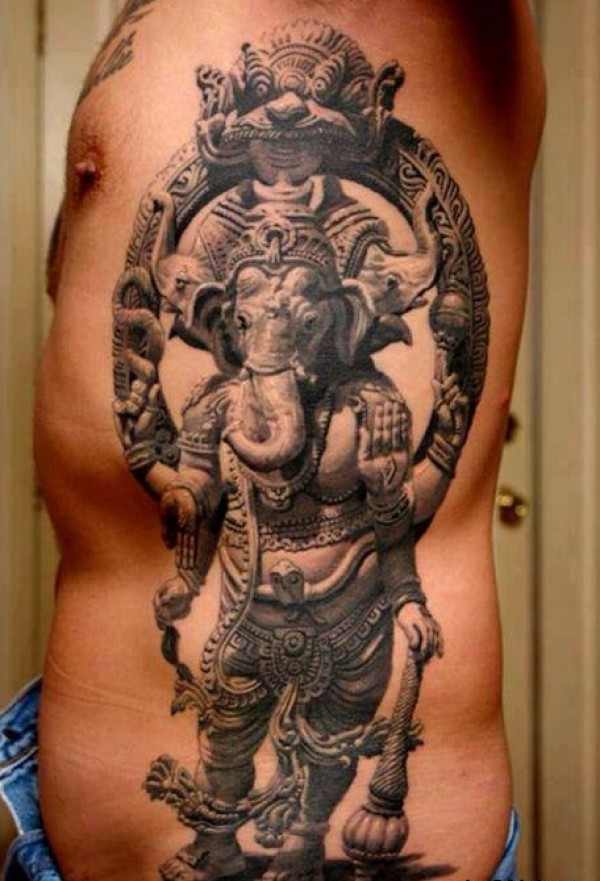 男士侧腰石雕象神纹身作品