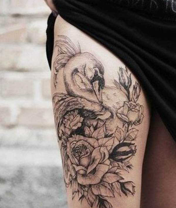 美女腿部点刺玫瑰与鹅纹身图案