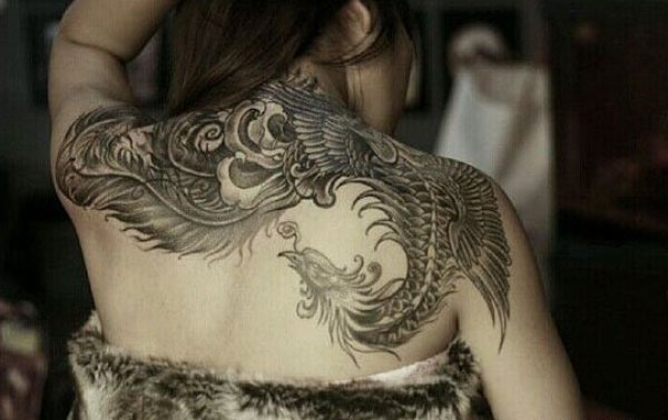 女生后肩背潮流经典的黑灰凤凰纹身图案