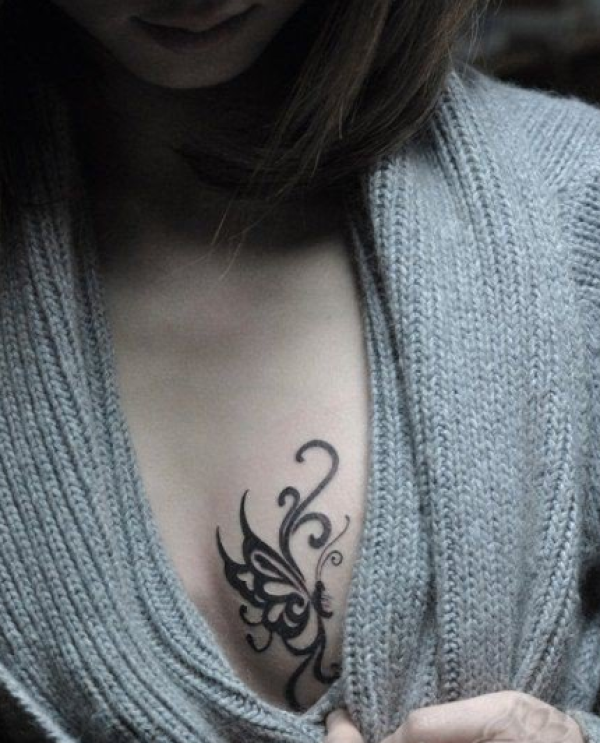潮流性感的女性胸部图腾蝴蝶纹身图片