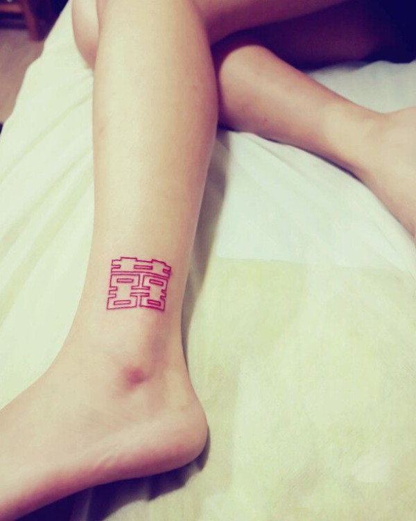 脚部时尚大红双囍字纹身图案