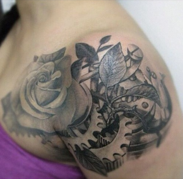 披肩玫瑰齿轮纹身图案