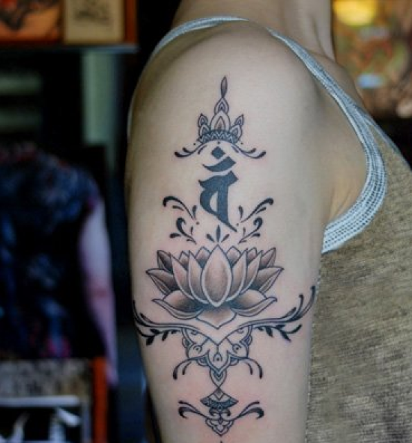 女生手臂莲花梵文图腾纹身