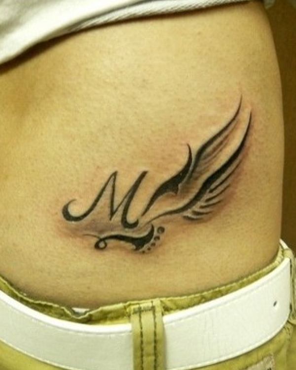 腰部图腾翅膀加字母纹身