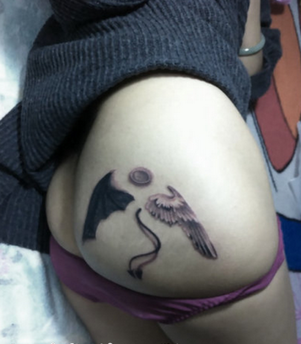 臀部翅膀纹身黑白纹身作品