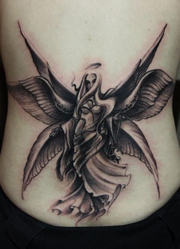 女生后腰纹身黑白灰风格抽象线条纹身图案