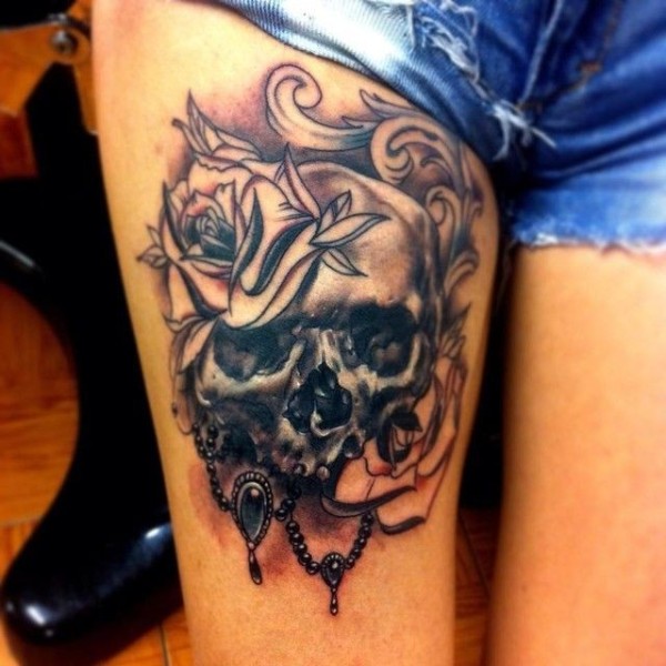 黑灰色玫瑰花和骷髅头纹身图片手稿