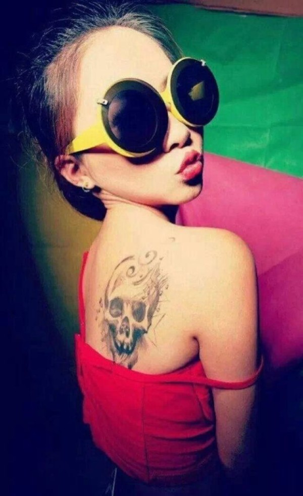 时尚美女背部黑灰骷髅纹身