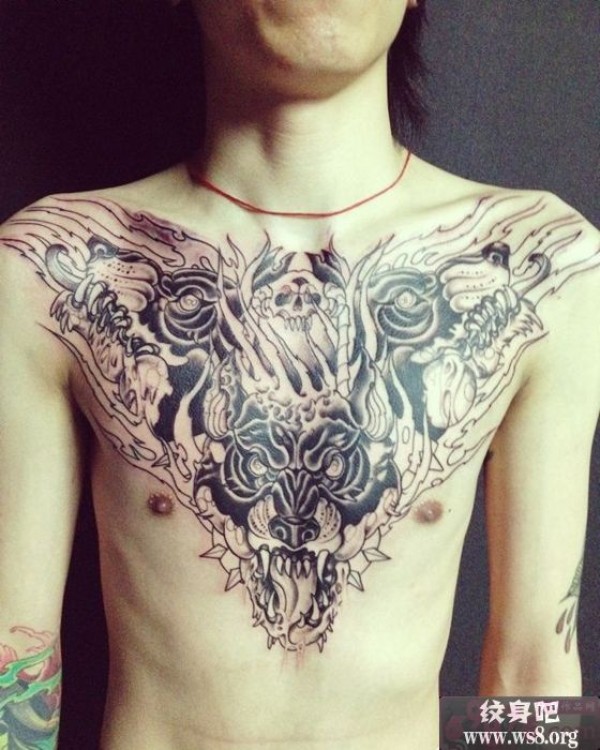 男人胸前超酷凶狠的狼头纹身图案_胸部纹身图案大全_纹身图吧